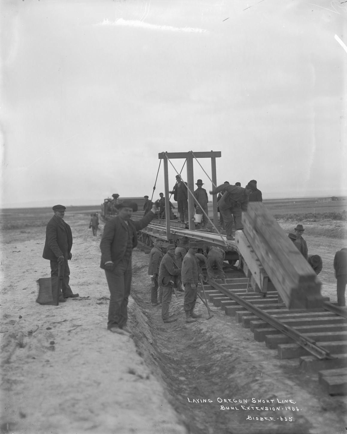 - "Laying the Oregon Short Line, Buhl Extension. 1906.; Men laying a railroad track.