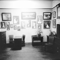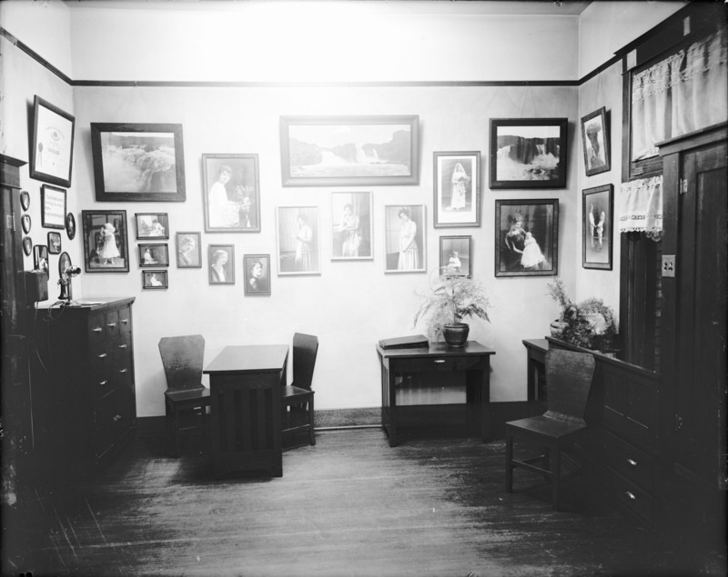 Interior view of the Bisbee Studio, consulting area with wall of photos. Bisbee's diploma from the Illinois College of Photography is on the wall above a cabinet.