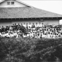 - Portrait of a large group of Japanese-Americans of all ages in front of a large building, possibly at the Fair grounds.