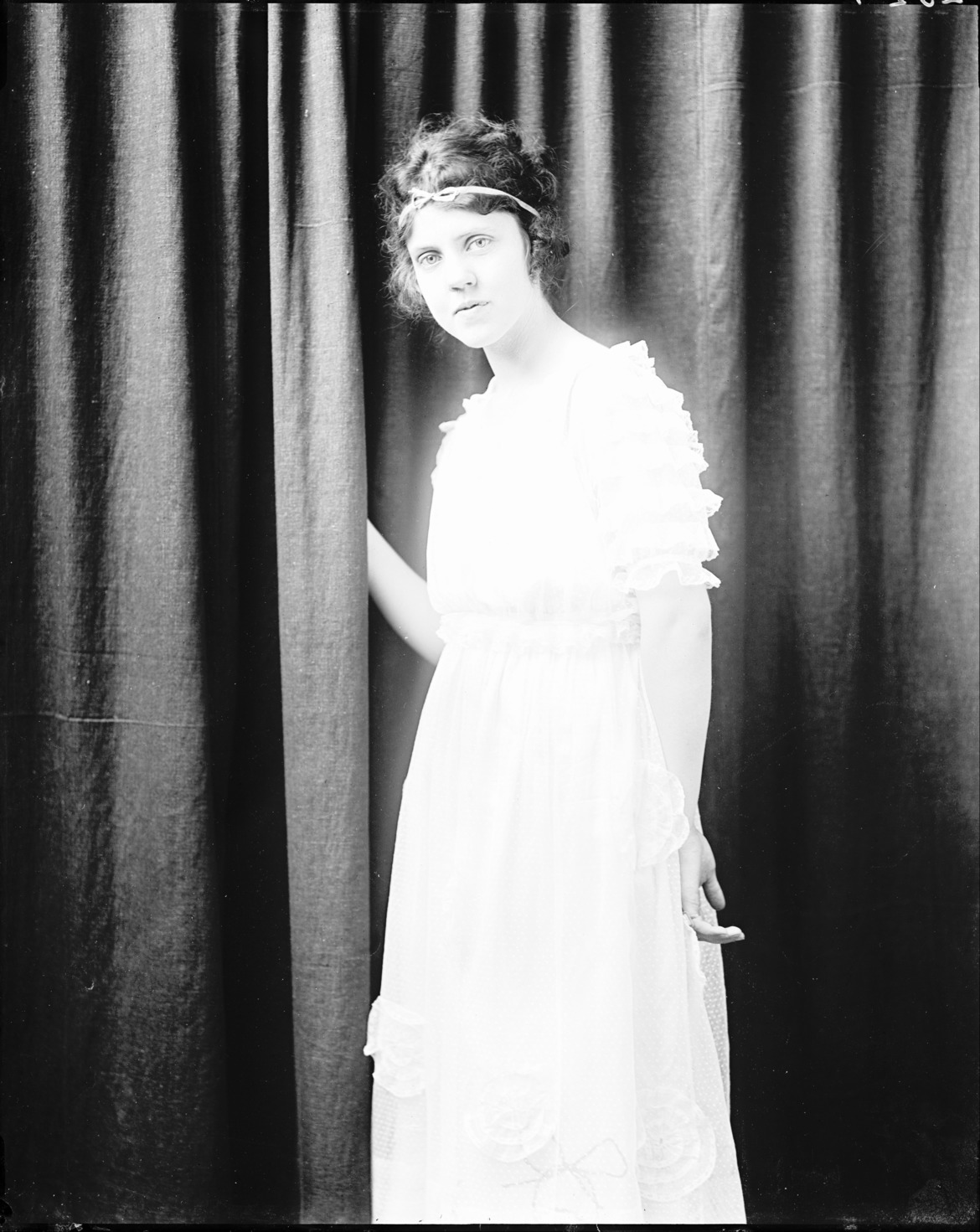 Portrait of a young woman, standing in front of a curtain that obscures her hand.