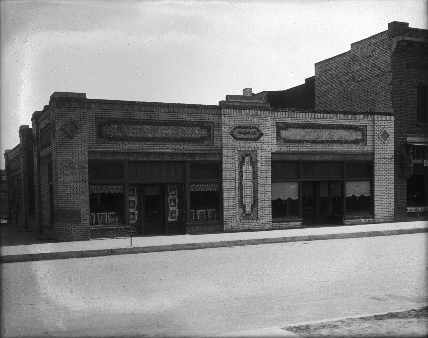 Exterior of the Bisbee Studio, with addition, looking at the entrance on 2nd St W. Bisbee's motto, "Life and Art Are One," is above the entrance. The addition looks unoccupied.