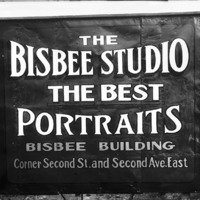 A Bisbee Studio advertisement on a signboard. It reads, "The Bisbee Studio; the Best Portraits, Bisbee Building; Corner Second St and Second Ave East."