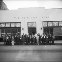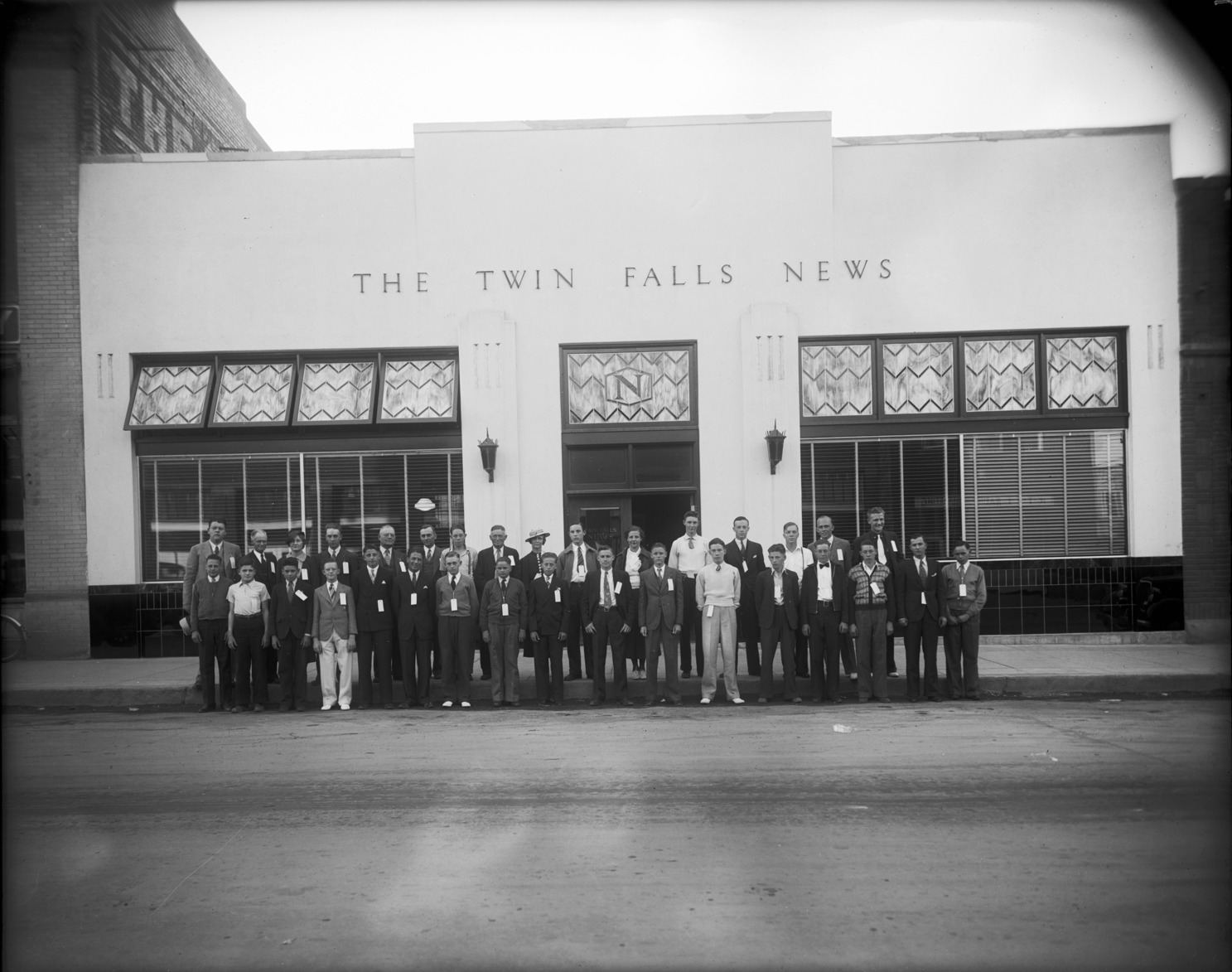 A group of people, all wearing tags, standing in front of the Twin Falls News Building.