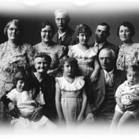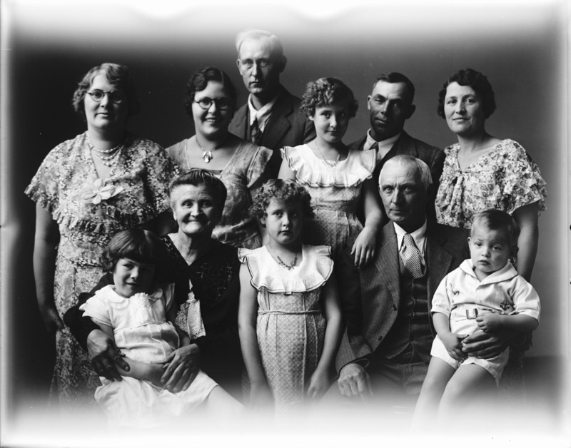 Portrait of a family of eleven people (three men, four women, three girls, and one boy).