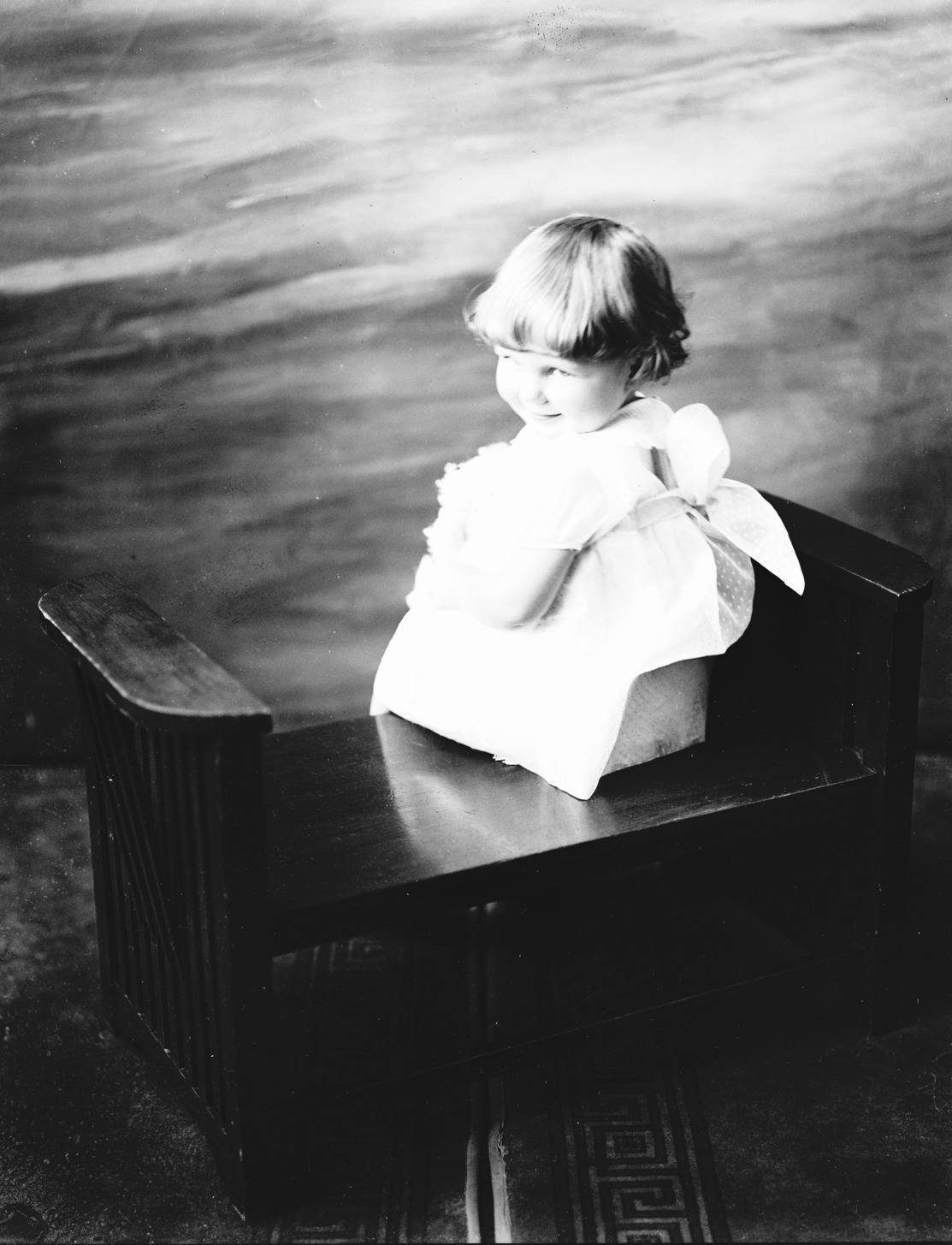 - Portrait of a little girl, seated, looking over her shoulder with her back to the camera.