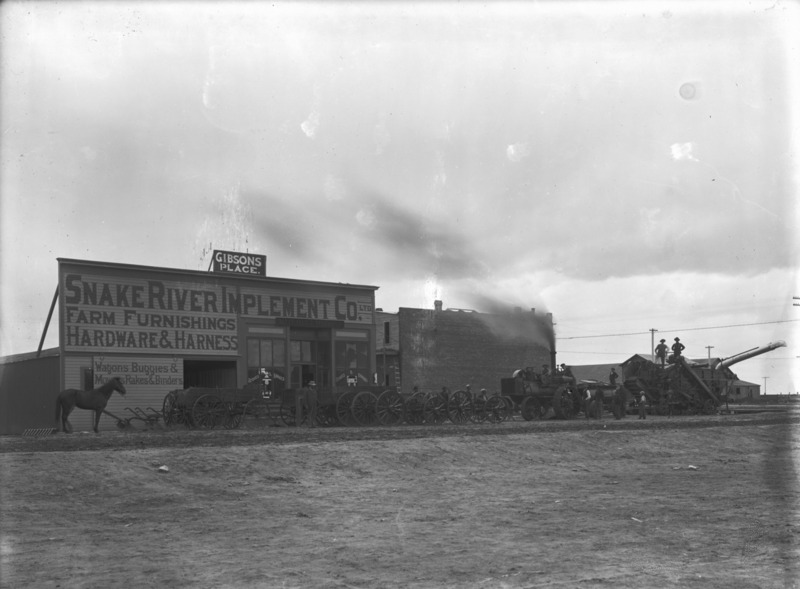 View of several buildings, with wagons, men, horses, and other farm equipment lining the street.Sign above one building reads, "Gibson's Place; Snake River Implement Co. Ltd. Farm Furnishings Hardware and Harness, Wagons Buggies and Mowers Rakes and Binders."