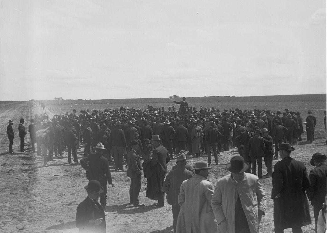 - A large group of men gathered around a speaker in a field; horses and/or cattle and a townsite in the distance.
