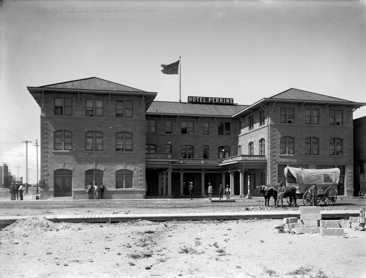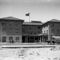 - Front view of the Hotel Perrine; Ezra Meeker, poses with his ox-team and wagon on his 1906 journey east along the original Oregon Trail.