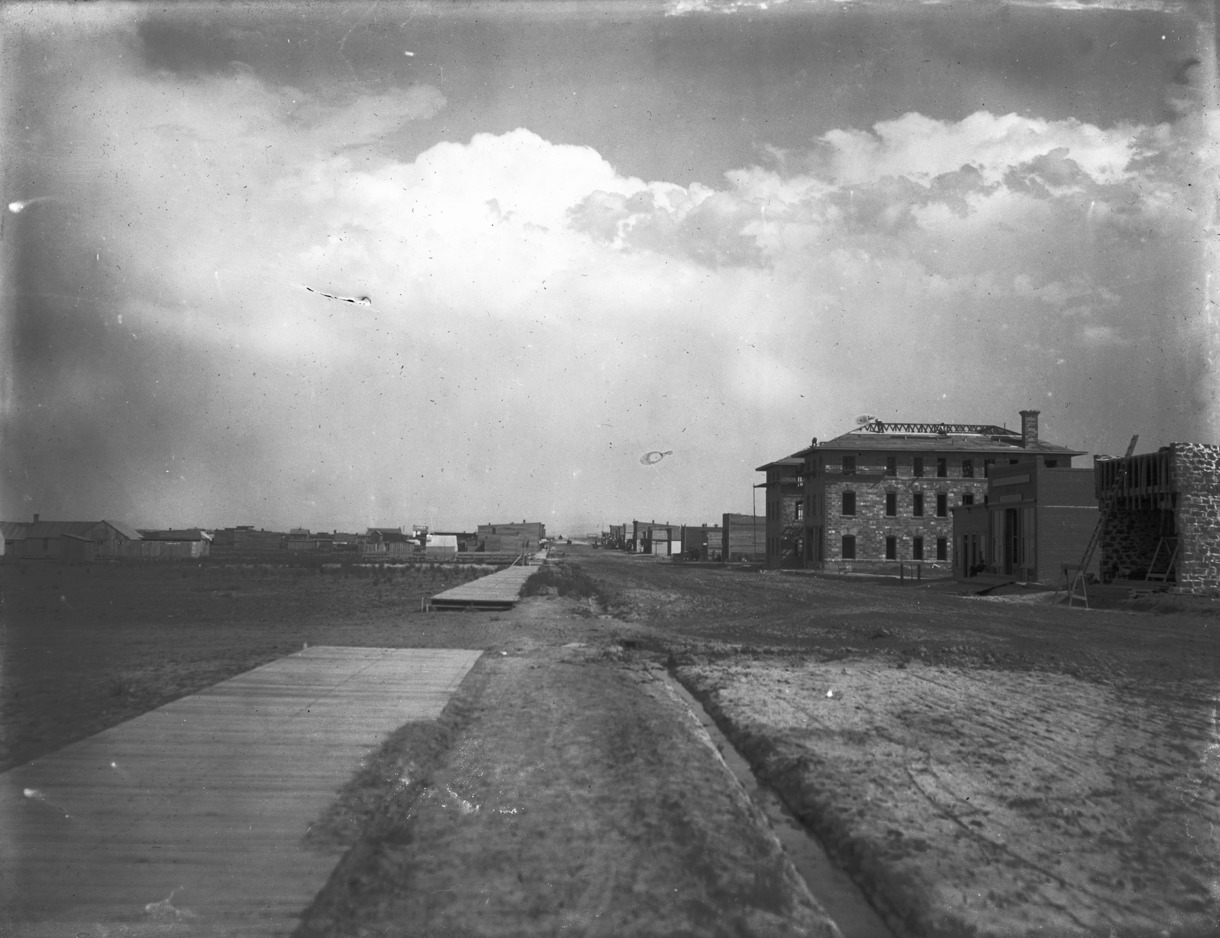 - Board sidewalks along Main Ave as early buildings are constructed, including the Sprague-Butler Pharmacy, and the Hotel Perrine..
