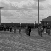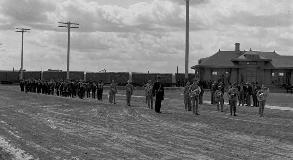 - A parade with a band and other marchers wearing regalia, in front of the Oregon Short Line Railroad Depot (Station) building.