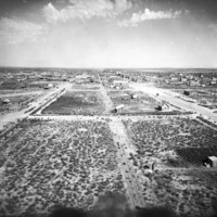 - An aerial view of early Twin Falls, looking northwest, taken from atop a water tower.