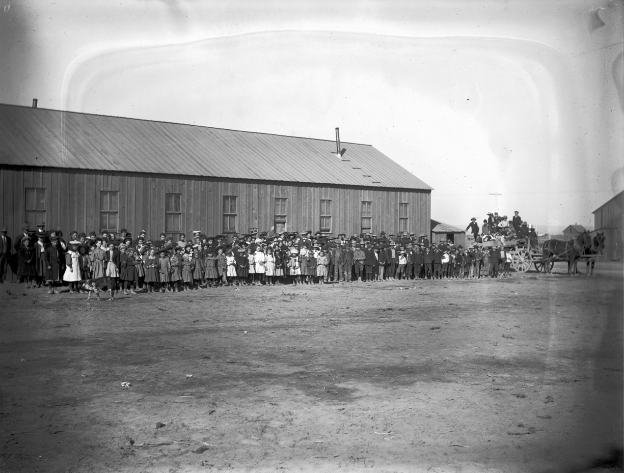 - A large group of school children posed at the side of the first school in Twin Falls.