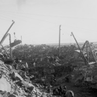 - Construction crews and derricks moving rock in a canal bed.