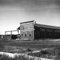 - Twin Falls Lumber Company Ltd building and yard. Three men stand near the entrance. The front of the building reads, "Twin Falls Lumber Co, LTD; Building Material and Hardware; Paints and Oils.