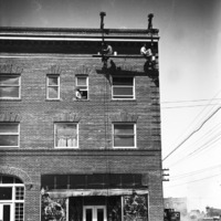 Two men with buckets seated on a hanging scaffold on the Rogerson Hotel. Another man looks on from a window. View is of the 2nd St E (now Gooding St E) side of the hotel.