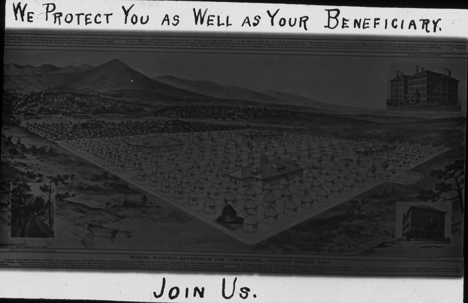 An advertisement for the Modern Woodmen Sanatorium for Tuberculosis in Colorado Springs, CO. A banner above and below the ad reads, "We protect you as well as your benficiary. Join us."