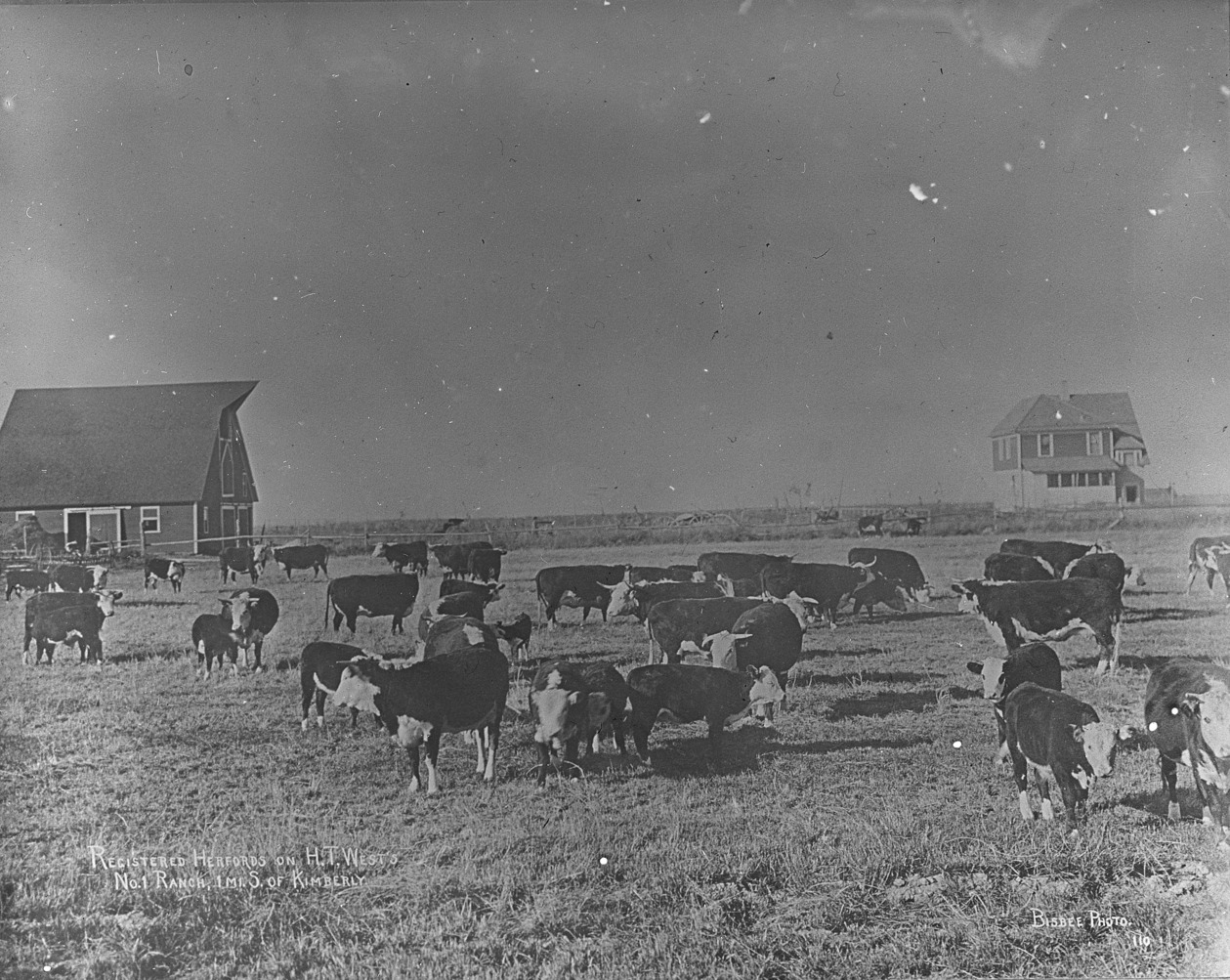- "Registered Herefords on H.T. West's No. 1 Ranch, 1 Mile South of Kimberly;" cattle stand in a field; a barn and house in the background.