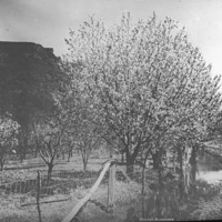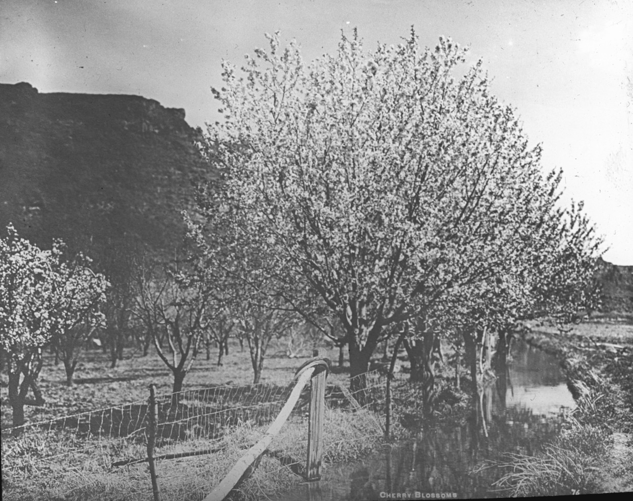 - "Cherry Blossoms;" cherry trees alongside a fence in the Snake River Canyon.