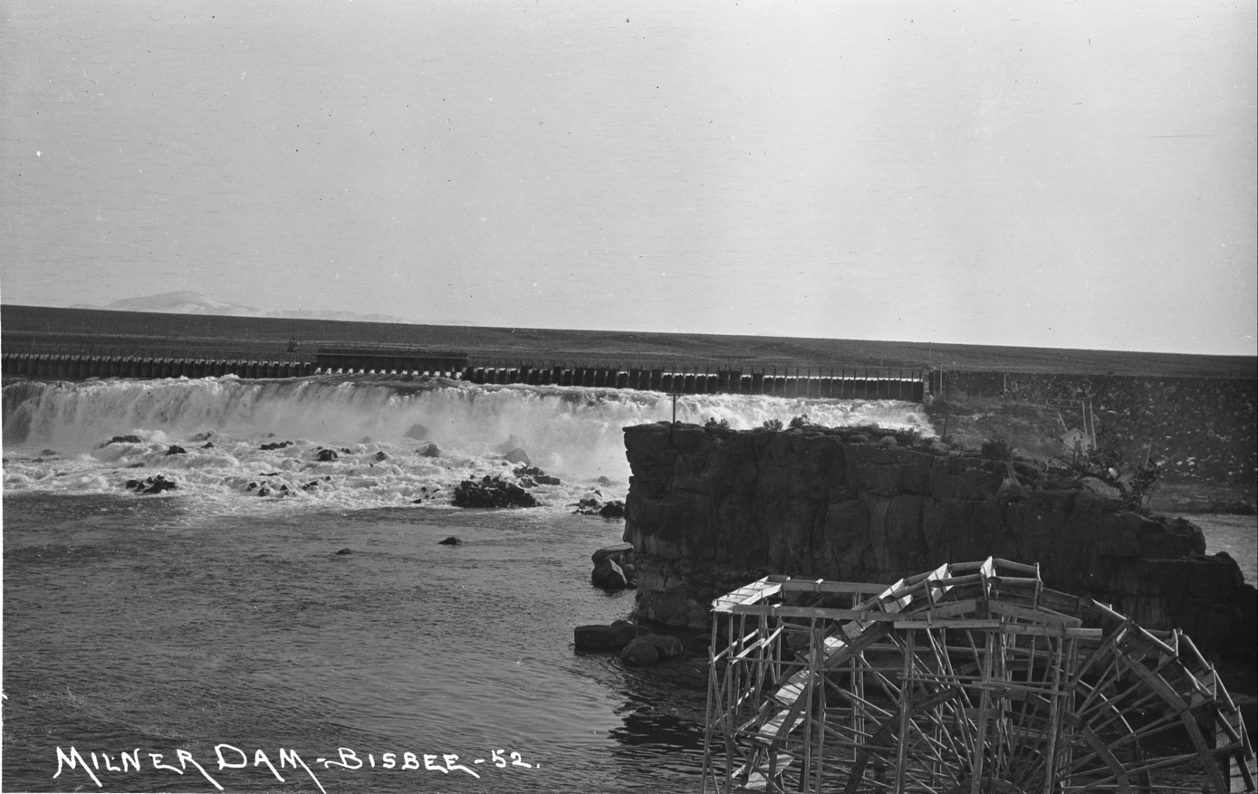 "Milner Dam;" head gates; wooden water wheel in foreground.