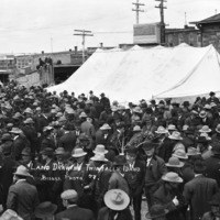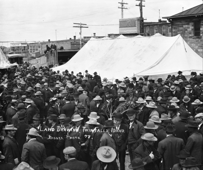 - "Land Drawing, Twin Falls, Idaho;" a large crowd of mostly men stand in front of a canvas tent erected in an alley behind a brick building.