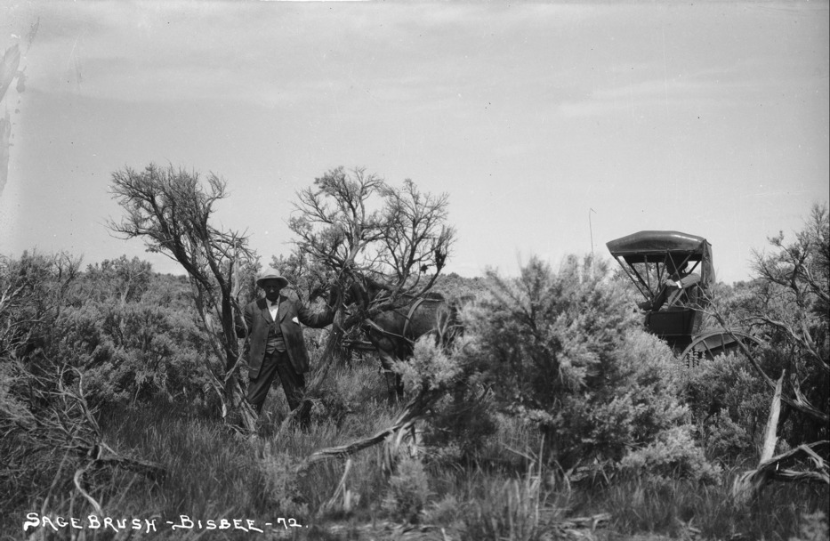"Sagebrush;" a man stands among sagebrush while another is seated in a buggy pulled by a couple of horses.