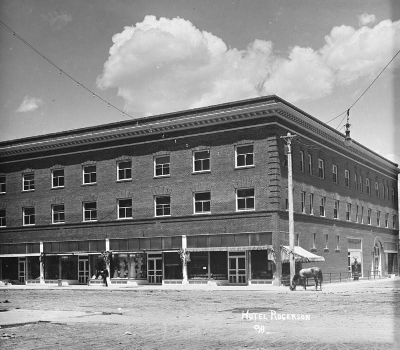 - "Hotel Rogerson; " view of the hotel from the corner of Main Ave E and 2nd St E (now Hansen St E); the road is unpaved, and a horse stands at the corner.