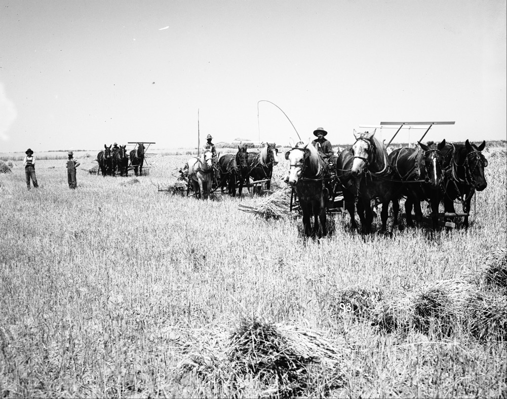 - Three men managing teams pulling a reaper-binder; two other men stacking sheaves in a grain field