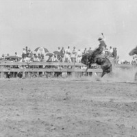 - Two cowboys on horses perform in front of a crowd of people behind a fence.