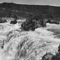 - "Shoshone Falls;" a man on the rocks in the foreground looks out over the Falls