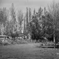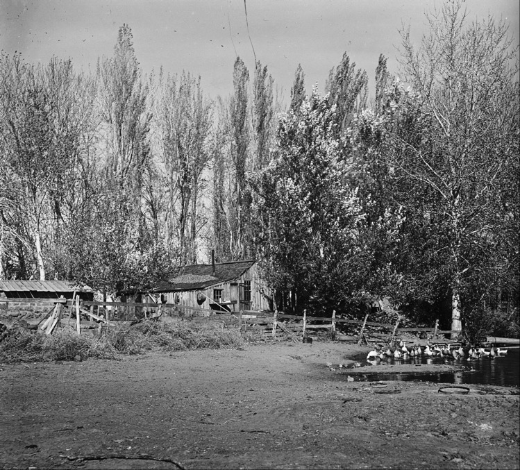 Ducks float on a pond near a wooded cabin set amongst trees