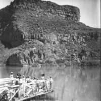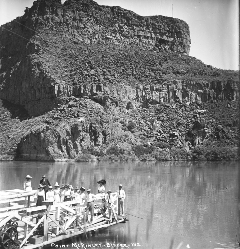 "Point McKinley;" a group of people ride on the ferry across the Snake River above the Shoshone Falls.