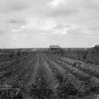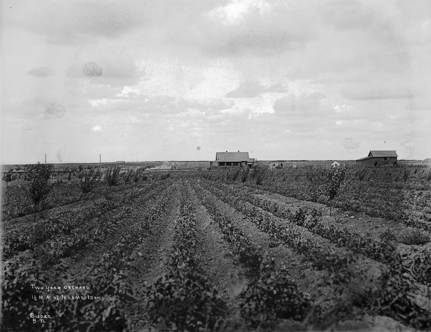 - "Two Year Orchard; 1 1/2 miles north of Jerome, Idaho;" looking down rows of an irrigated field at a farmstead with house and several outbuildings