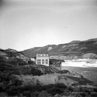 "Lower Salmon Power Plant;" view of the lower salmon falls with the power plant and another building on the bluff beside the river.
