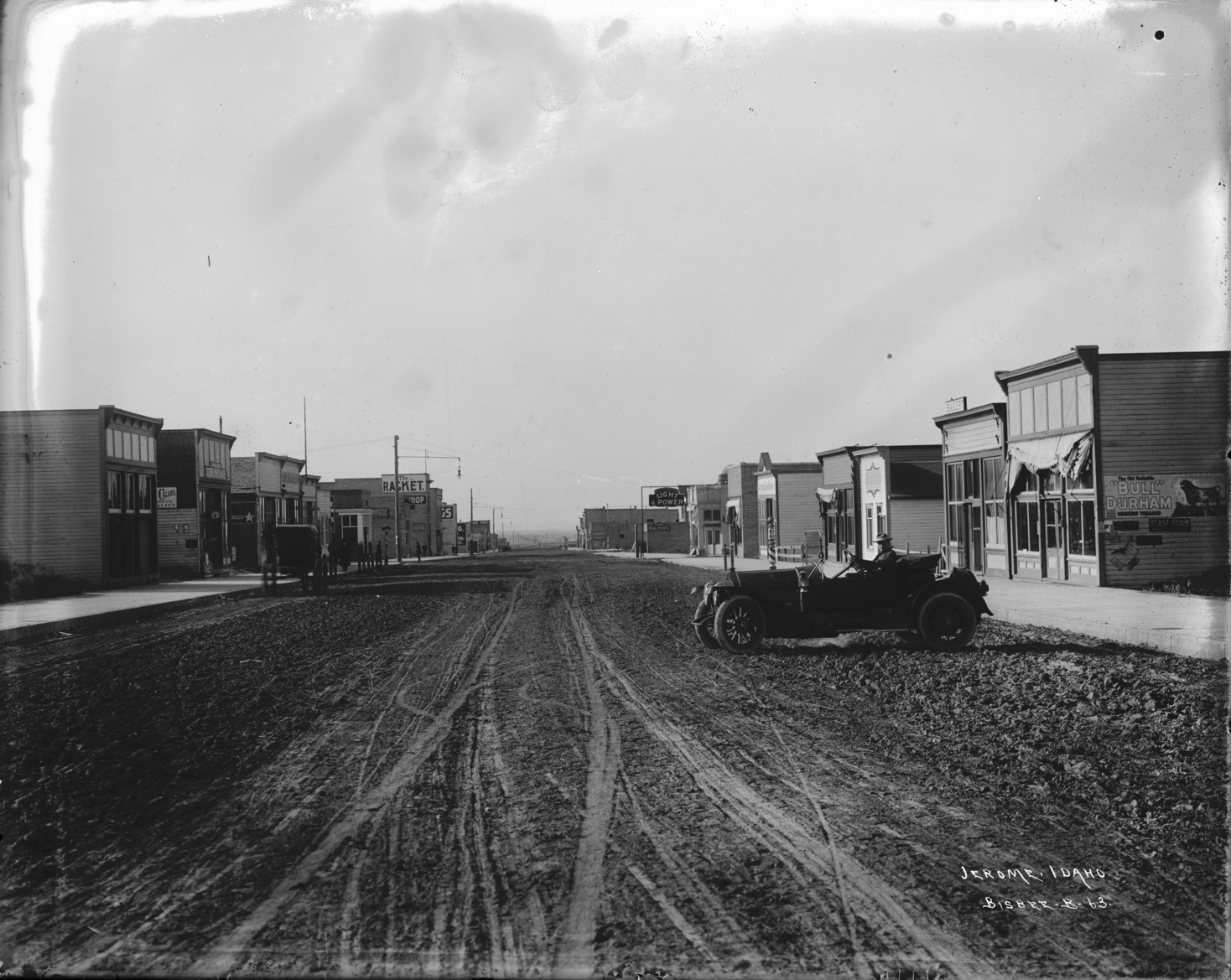 - "Jerome, Idaho;" a look down a street in Jerome, with a man in an automobile parked in the street. Also visible are signs advertising cigars and tobacco; "The Racket;" the North Side News; Real Estate; Light and Power; a barber, and a bakery.