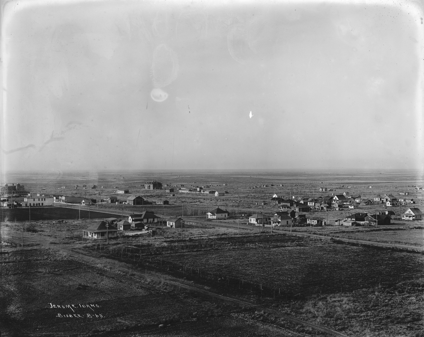 - "Jerome, Idaho;" wide view of the town taken from the water tower. Visible are Lincoln School (center left), a restaurant. The North Side Inn is at the very left.