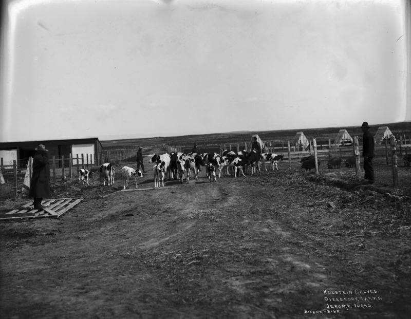 - "Holstein Calves; Overbrook Farms; Jerome, Idaho;" several men stand alongside a herd of cows as they direct them down a fenced lane into a pasture. A few pigs stand in a fenced area on right.