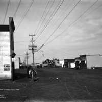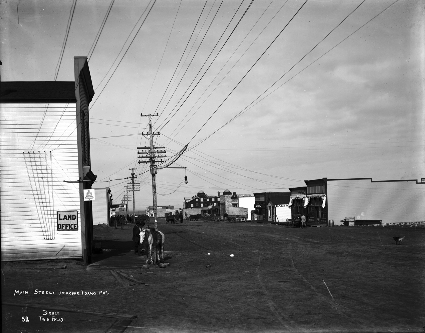 - "Main Street, Jerome, Idaho, 1909;" view down the street. Visible businesses include: the land office; a furniture store, Haddock Land Co; Jerome State Bank; Ott's Lunch Room, a meat market, and a bakery. The North Side Inn is in the center background.