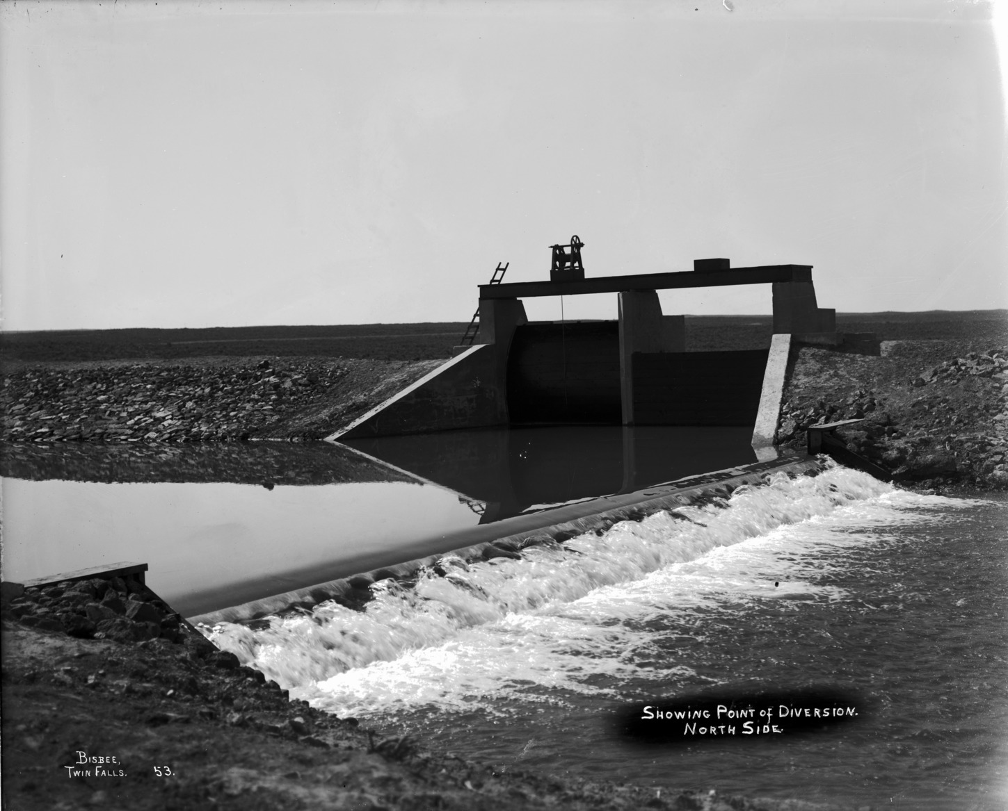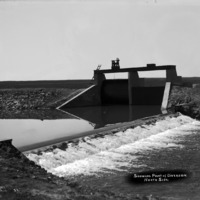 "Showing Point of Diversion. North Side;" water flowing over diversion channel near gates