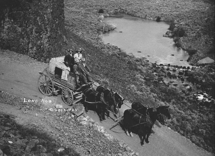 "Long Ago;" A stagecoach parked on the grade above the Blue Lakes.
