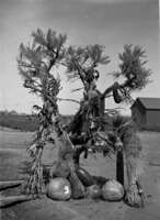 1881 A large sagebrush draped with agricultural produce.