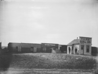 1890 Workmen assembled on the roof sections and on the ground before the nearly completed hotel at Milner Dam.