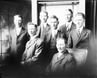 1689 Portrait of seven men of varying ages, all dressed in suits.