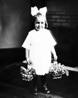 1682 Portrait of a young girl with a large bow in her hair, holding two baskets of flowers.